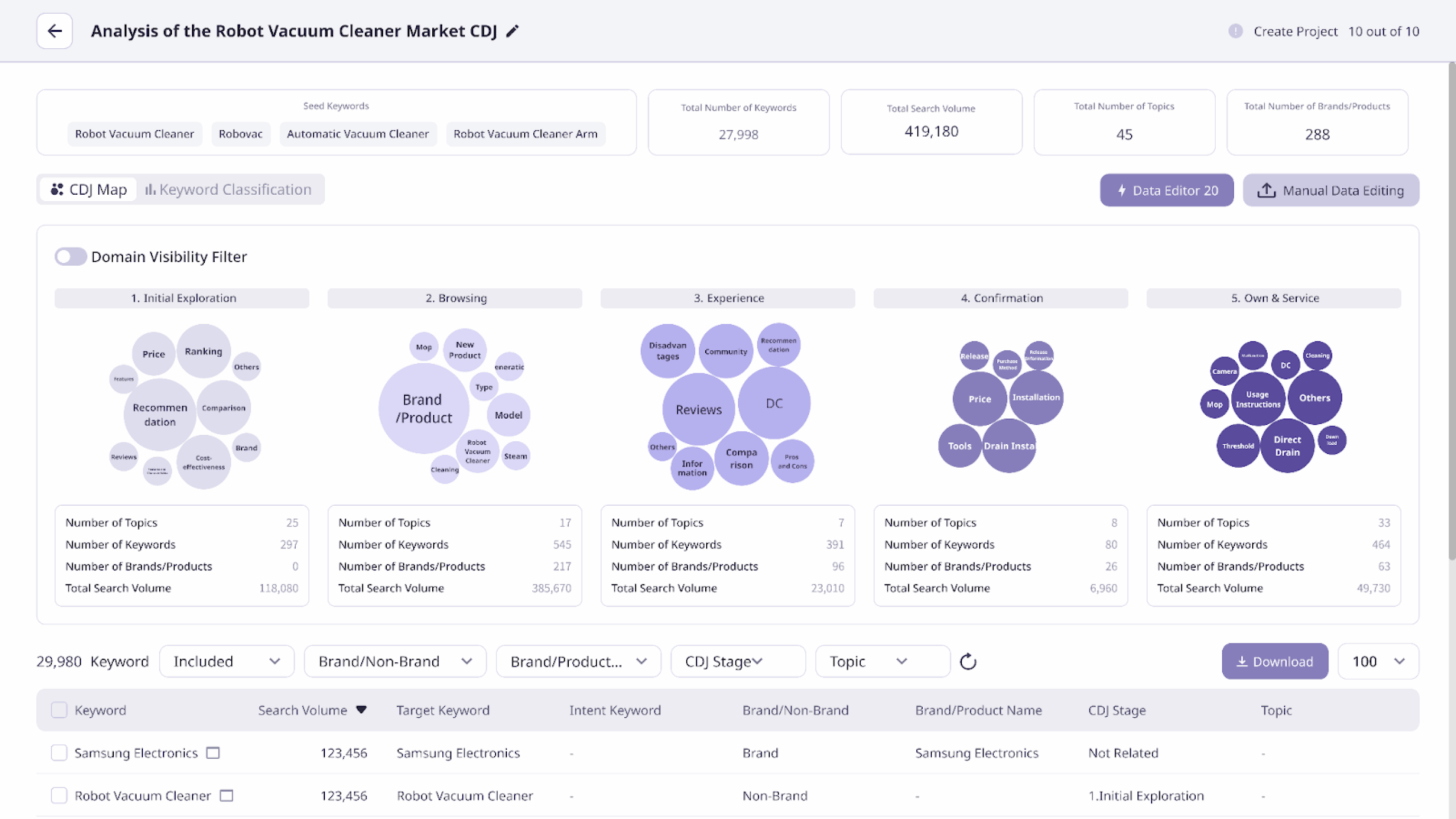 Journey Finder Visualizes the complete Customer Decision Journey (CDJ) from the very first search to purchase and beyond. By mapping every stage- exploration, comparison, experience, confirmation, and services- it reveals how real consumers explore, switch, and make decisions..