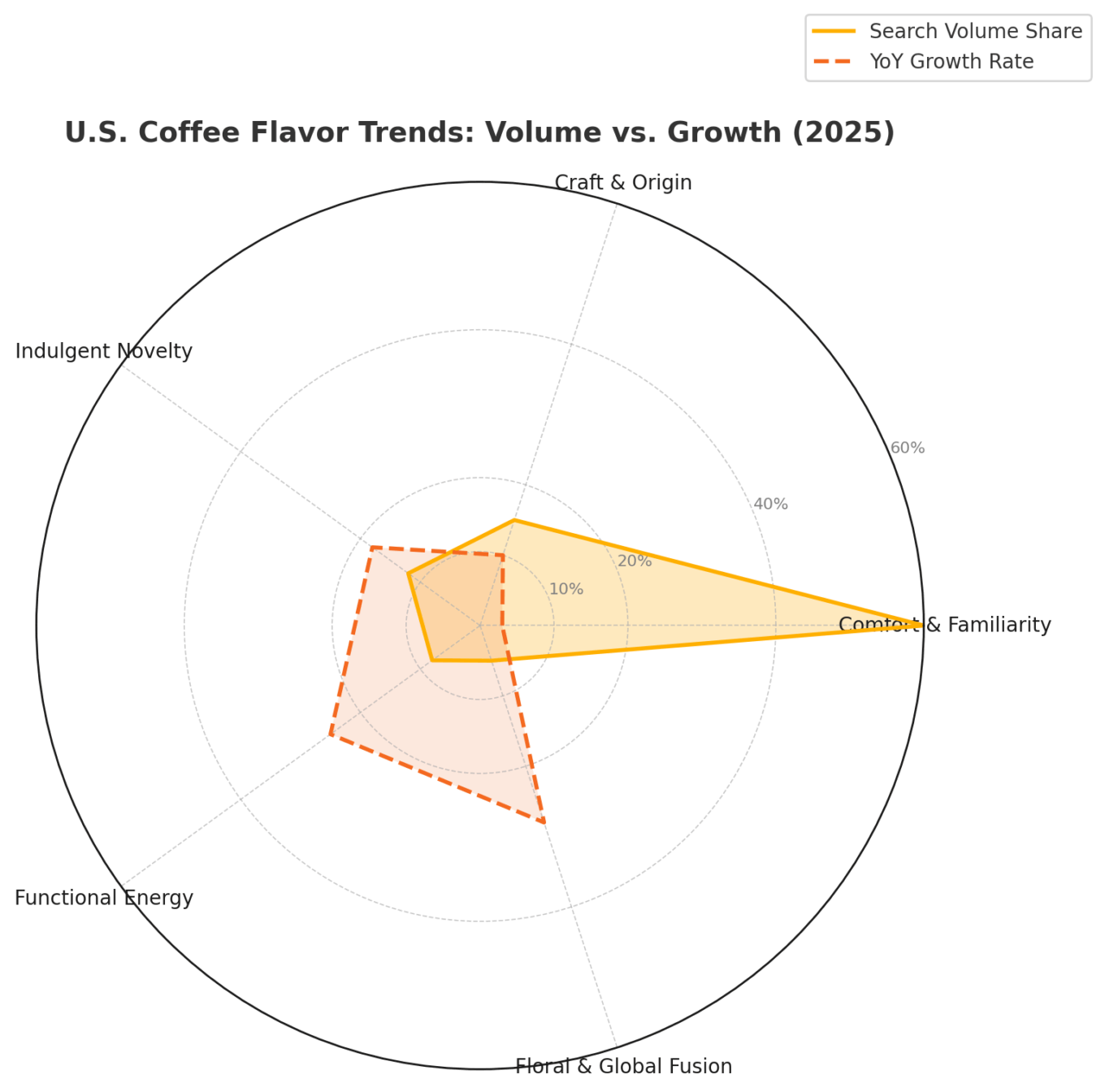 - Comfort & Familiarity (Vanilla, Caramel) dominates volume but shows low momentum.