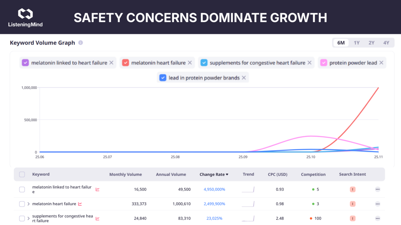To search for trending keywords, we filtered out keywords with a search volume below 10,000 and then sorted by positive change rate over the past 6 months. Safety and risk queries, not benefit or “how to” searches, are driving the largest recent growth among big-volume supplement keywords. The data is not a scatter of random interest: it’s a concentrated pattern where safety-related topics (melatonin + cardiac risk; lead/heavy-metal concerns in protein) produce the largest absolute increases in search traffic.
