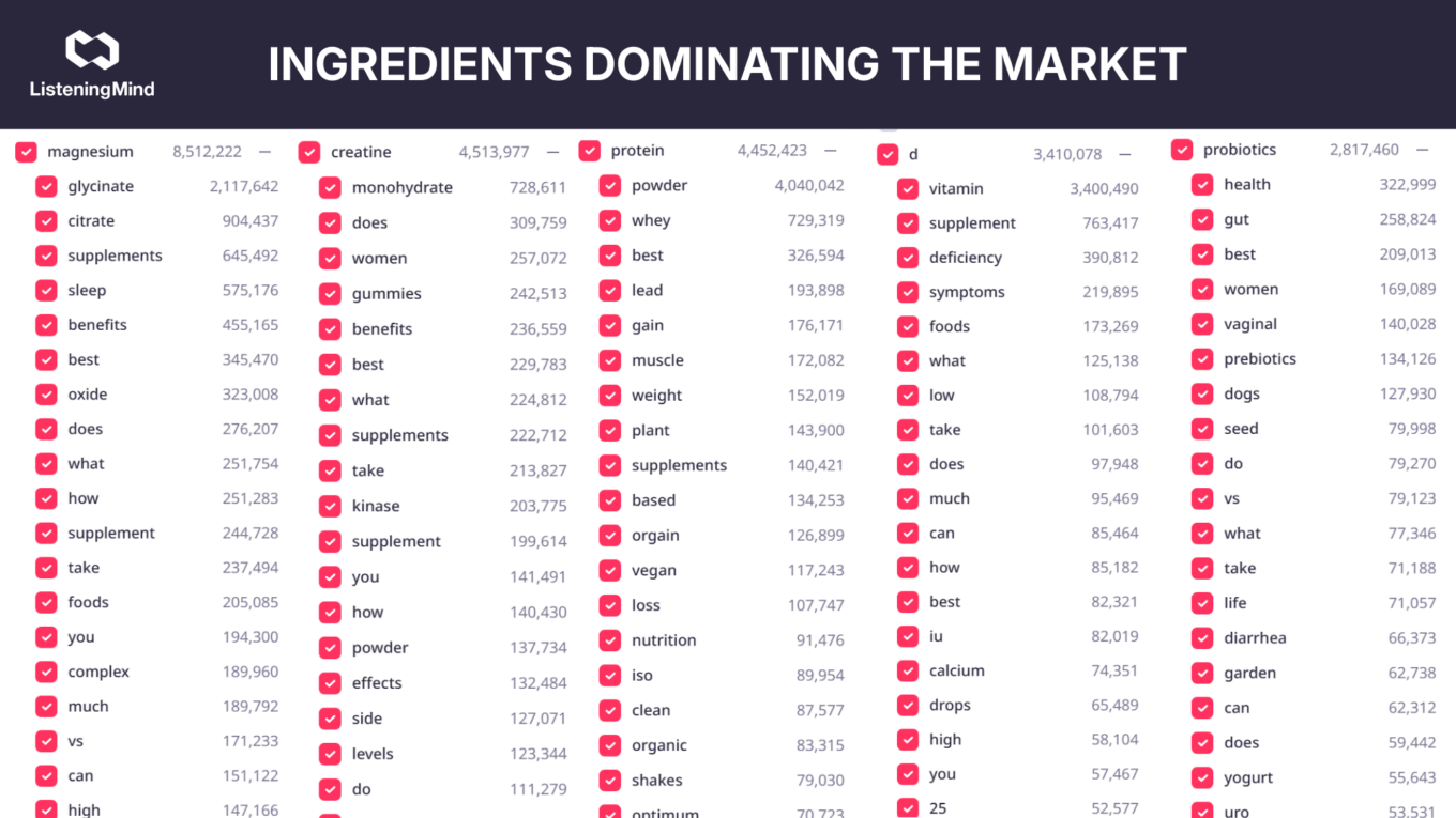 Explore real U.S. intent data across brands, ingredients, and use cases with ListeningMind, and move beyond assumptions to evidence-backed decisions. Sign up for a free 1-week ListeningMind Trial.
