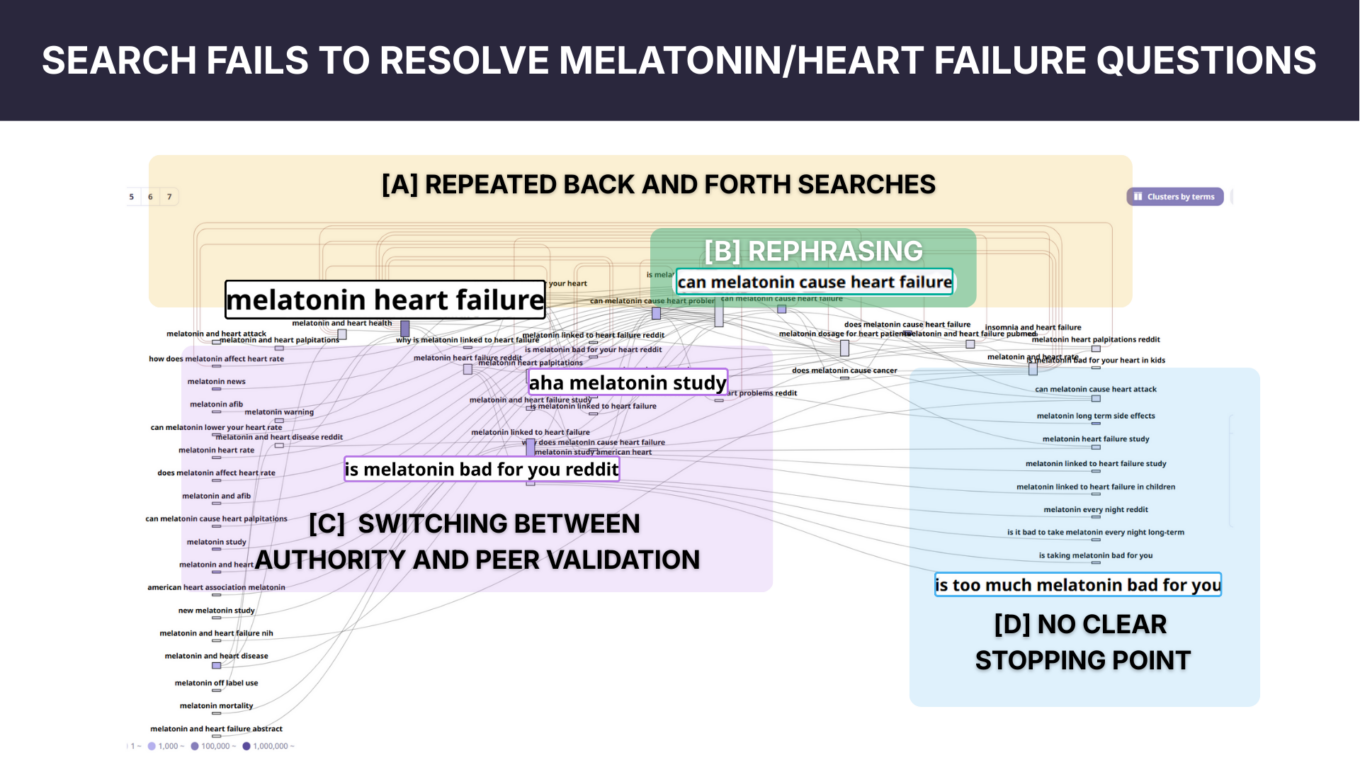 Trend analysis indicates that recent growth among large-volume supplement keywords is concentrated in safety- and risk-related queries. The melatonin case study illustrates how these concerns surface in search behavior, producing dense topic clusters and extended search paths as users seek clarification.