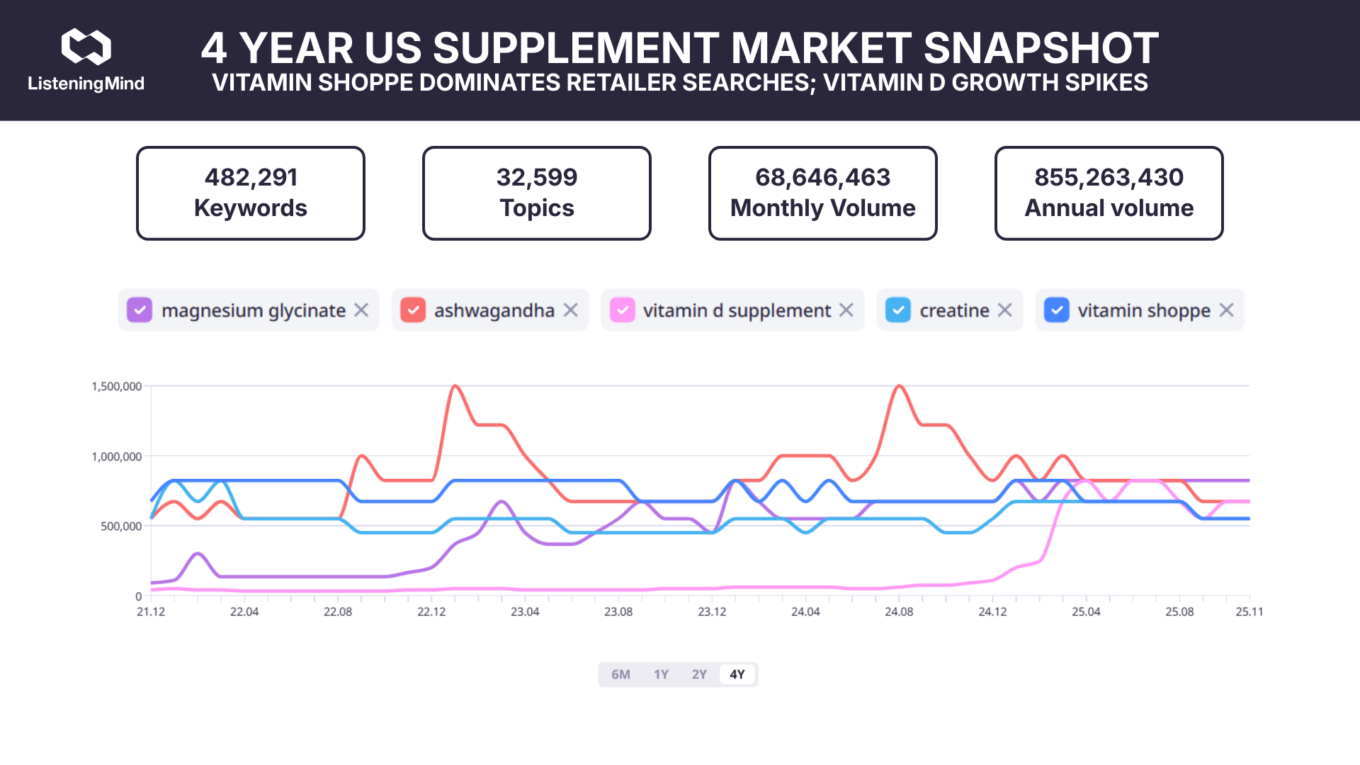 This analysis identified 482,291 U.S. supplement-related keywords, grouped into 32,599 topics, across a four-year period (December 2021 to November 2025), representing approximately 68.6 million monthly searches. The keywords with the highest search volume were magnesium glycinate (823,000/mo), ashwagandha (673,000/mo),vitamin d supplement (632,000/mo), creatine (550,000/mo), and vitamin shoppe (550,000/mo), reflecting a mix of ingredient-driven, retailer-driven, and product-format searches.