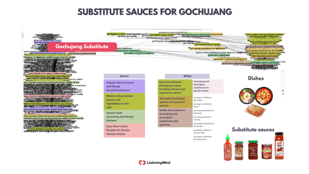 At the same time, search patterns also reveal demand for variations such as non-spicy, soy-free, and gluten-free gochujang, as well as interest in substitutes. This indicates both growing awareness of the ingredient and a need for wider accessibility.