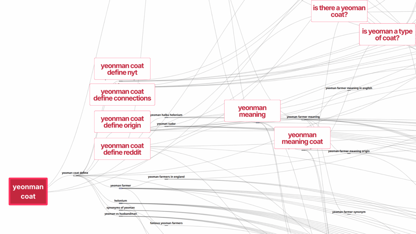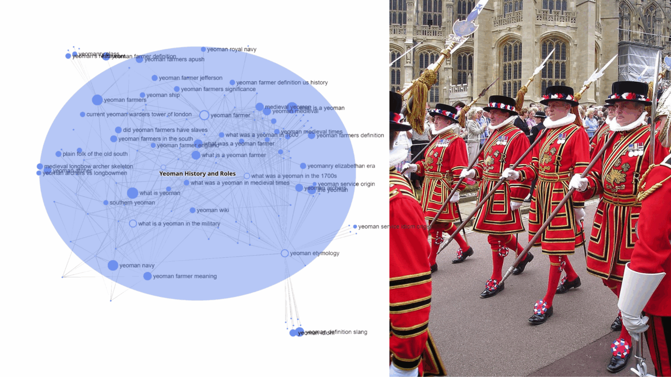 Search data around the word “yeoman coat” reveals a dense network of related queries about history, military service, and class identity. This cluster, centered on “Yeoman History and Roles”, shows how people continue to connect the word with Britain’s social and military past.