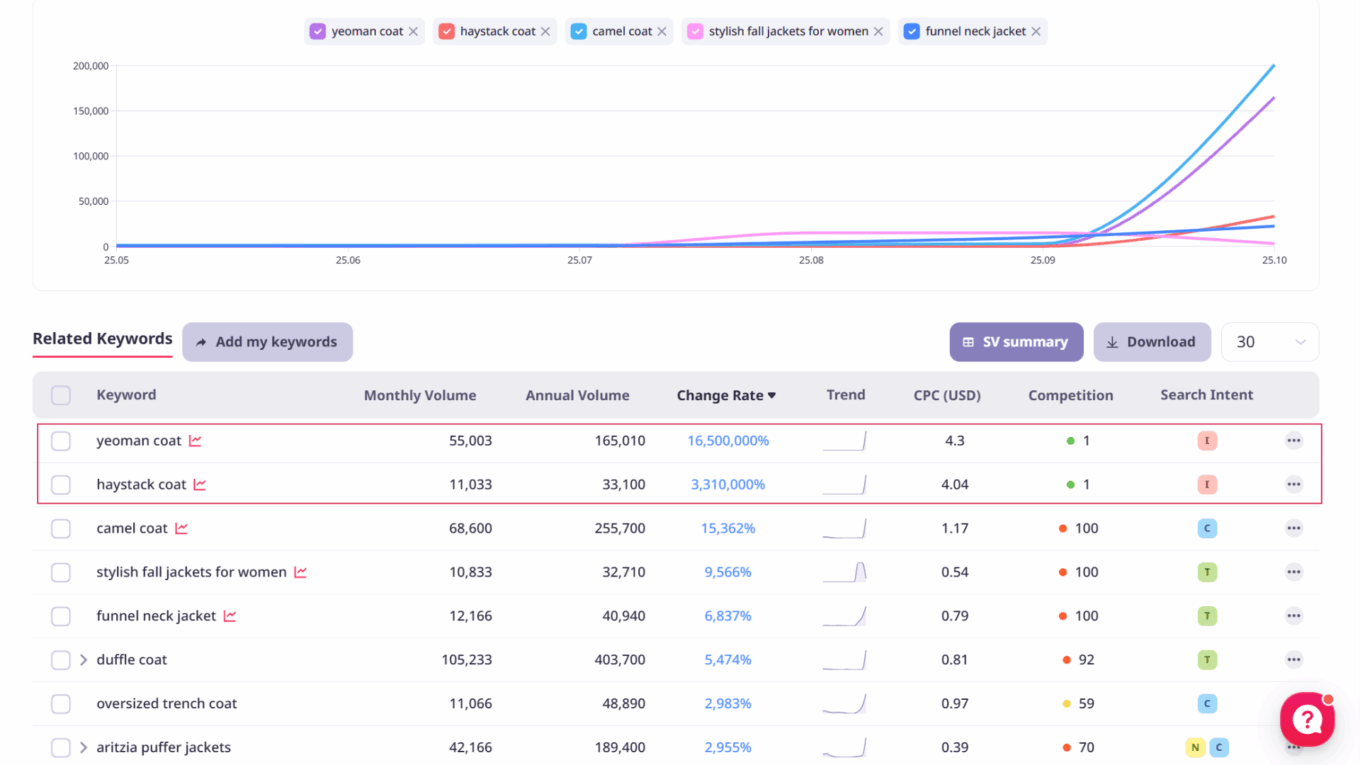 ListeningMind’s Intent Finder showed that “yeoman coat” reached an estimated 165,000 U.S. searches in early October 2025, with a monthly average around 55,000 afterward. Both terms showed high informational intent—people were searching to understand the words, not necessarily to buy products.