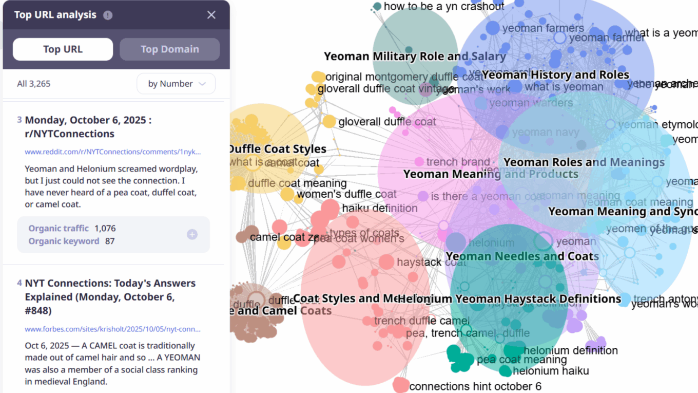 Cluster Finder gave the needed insight. After Wikipedia and Merriam-Webster, the third top URL was a Reddit post discussing a New York Times Connections Puzzle from October 6, 2025, the timing of which the spike aligns precisely the spike.