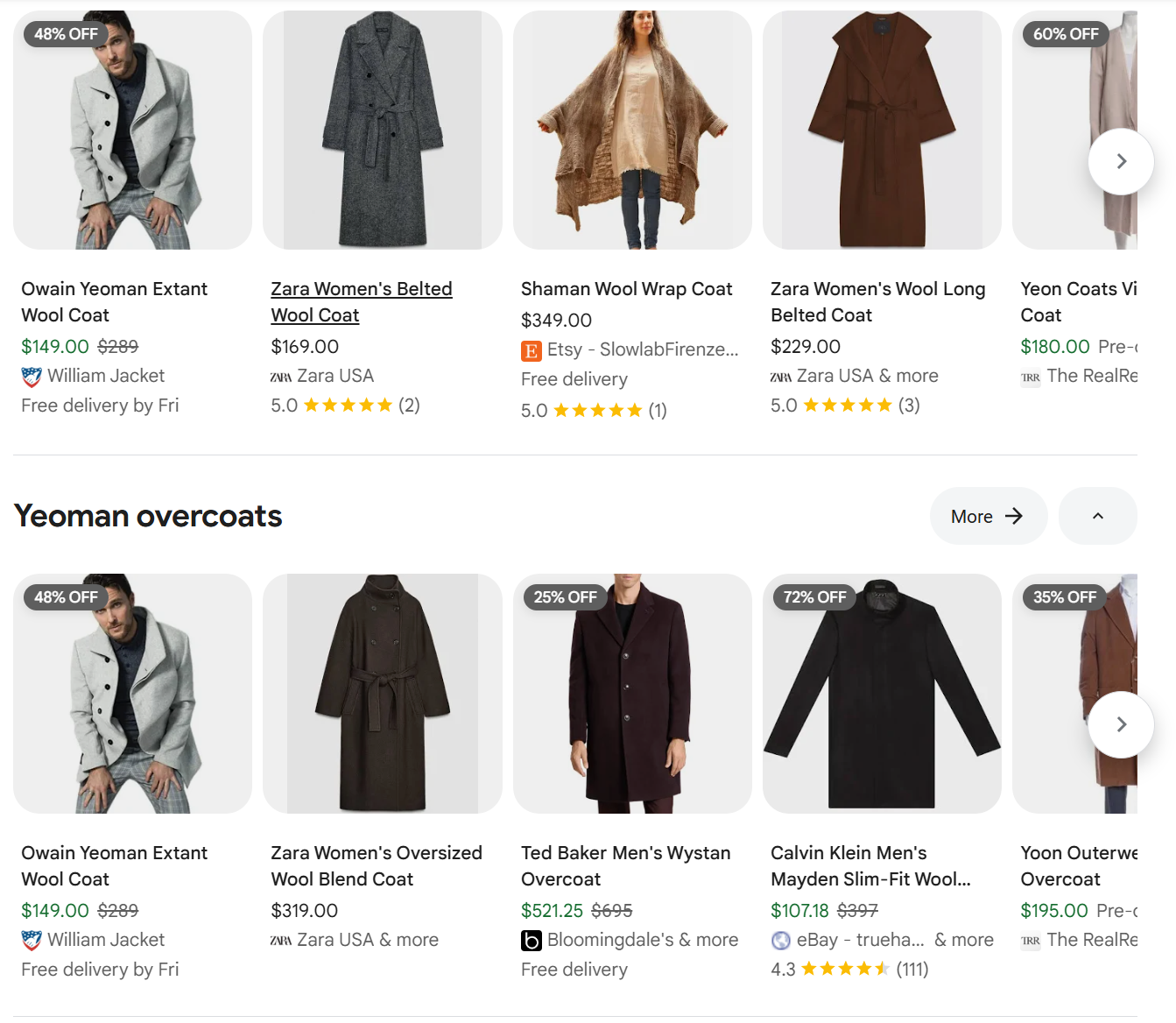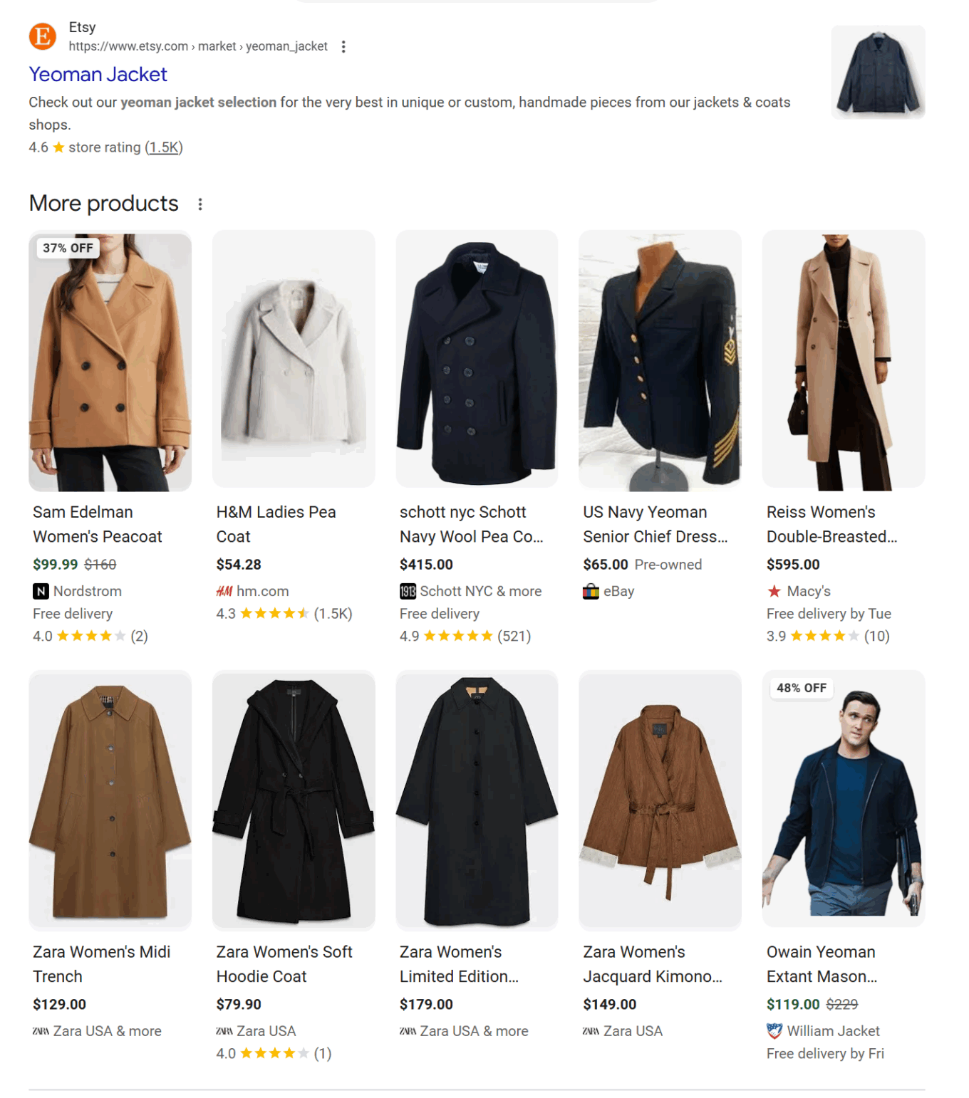By November 2025, “yeoman coat” began appearing in Google Shopping and retail search results. The listings include: